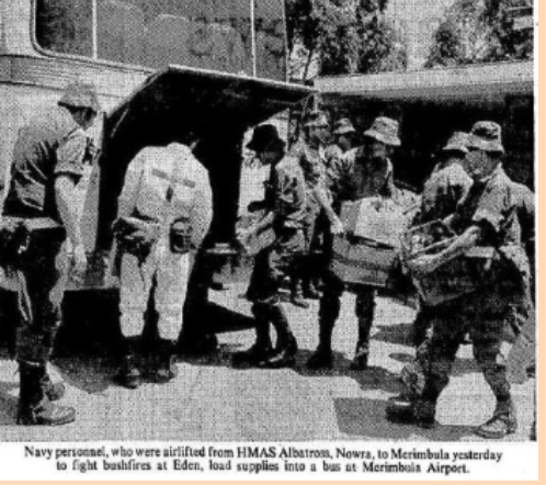 Yesterday afternoon, 100 RAN personnel were flown from HMAS Albatross, Nowra, to Merimbula, the nearest airfield to the fire.
