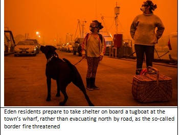 (The Guardian) – The situation is deteriorating in Eden on the Far South Coast. A bushfire moved quickly up from the NSW-Victorian border last night, as the southerly change moved up the coast and turned fires northward. The fire, dubbed the “border fire”, burnt last night from the Victorian border to Victorian Border to the southern shores of Twofold Bay. [UPDATE: Eden has been declared safe. –Des]